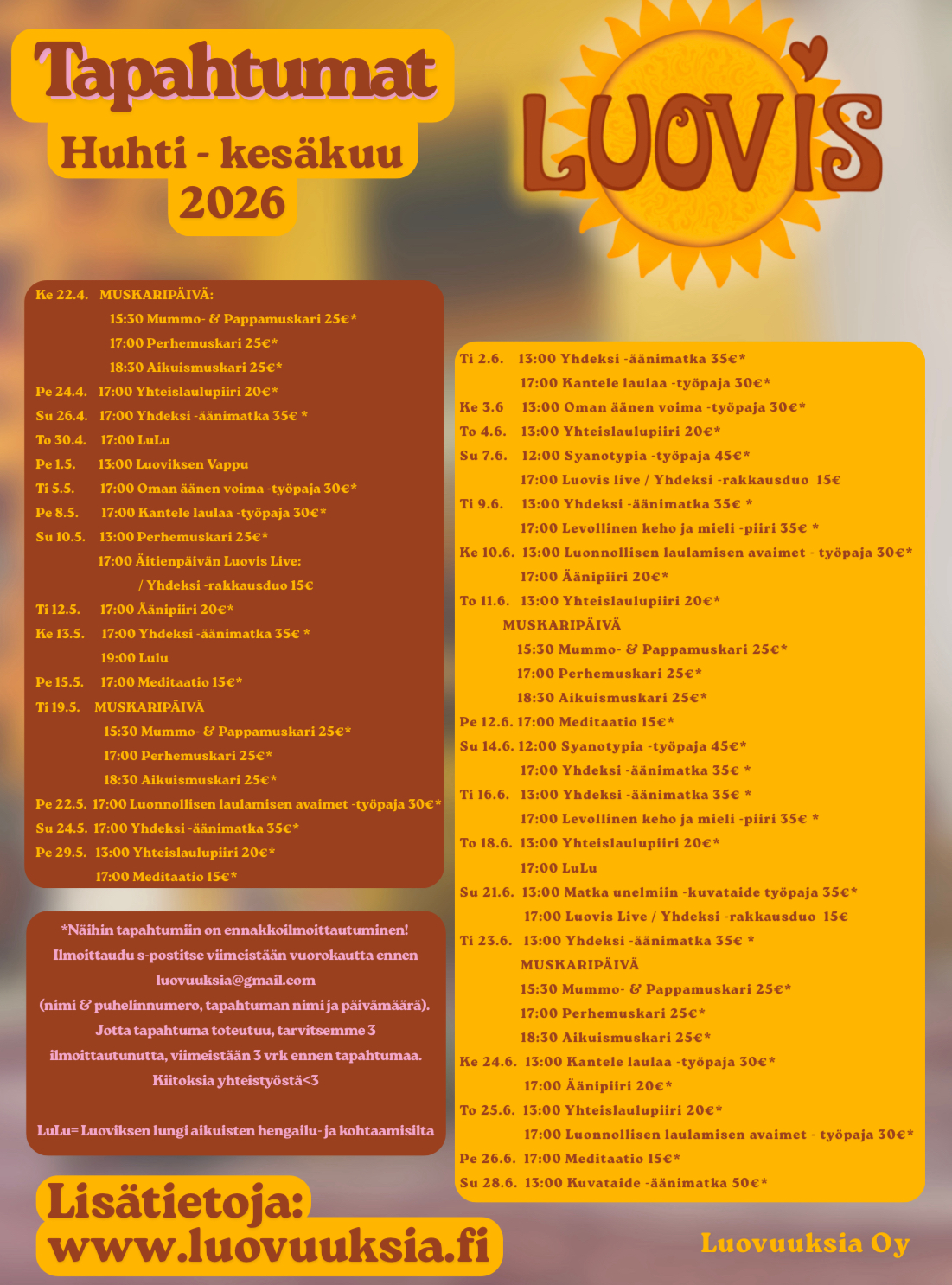 Huomaathan että tapahtumiin on ennakkoilmoittautuminen viimeistään vrk ennen tapahtumaa!